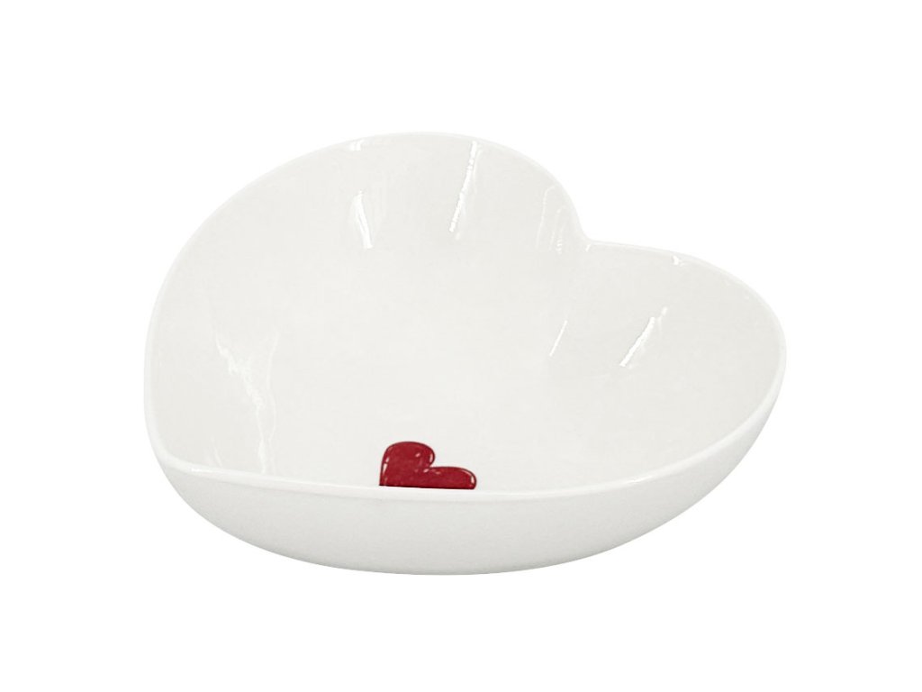 Porcelánová mistička Srdce Valentýn o průměru 12,5 cm je ideální pro servírování drobného občerstvení, dezertů nebo oříšků. Bílá glazura s jemnými červenými srdíčky dodává elegantní a stylový vzhled, který skvěle doplní váš stůl nejen na Valentýna, ale i při každodenním stolování.