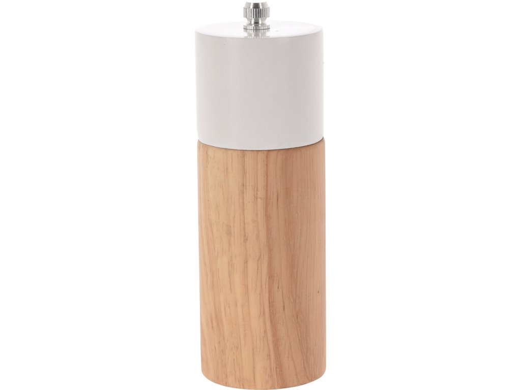 Dřevěný mlýnek na pepř v moderním minimalistickém vzhledu. Mlýnek na pepř využijeme každý den u jídelního stolu a současně i v kuchyni při vaření. Hrubost či naopak jemnost mletí pepře nastavíte jednoduše utažením nebo povolením stříbrné matky na víku mlýnku. Mlecí mechanismus je keramický. Tělo mlýnku je vyrobeno ze světlého dřeva kaučukovníku. Toto dřevo je označováno jako tvrdé a odolné. Světlé dřevo v kombinaci s bílou matnou barvou víka dodává mlýnku minimalistický a čistý design.