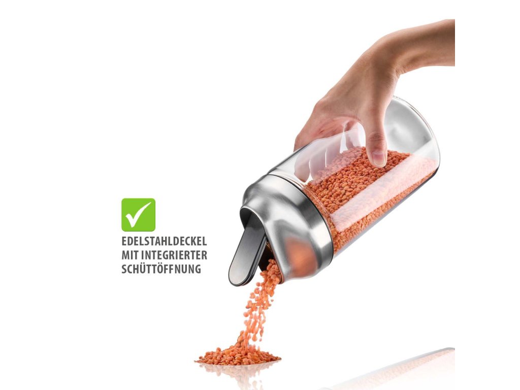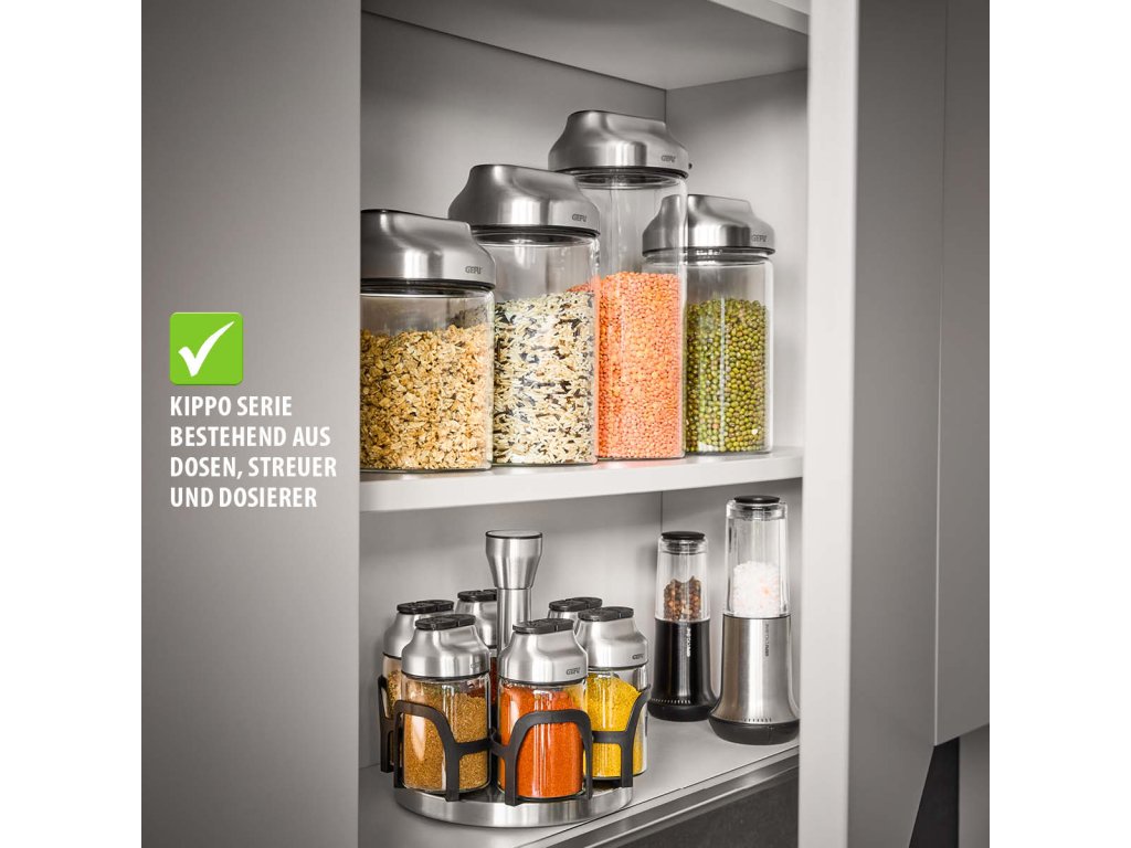 Nádoba na potraviny KIPPO je ideálním řešením pro všechny, kteří chtějí mít kuchyňské police dokonale uspořádané a zároveň ocení funkční design. Integrovaná funkce naklápění ve víku umožňuje snadné a přímé dávkování bez nutnosti úplného odšroubování víka. Stačí jednoduchý pohyb ruky a potraviny lze přesně a čistě nasypat nebo nalít.