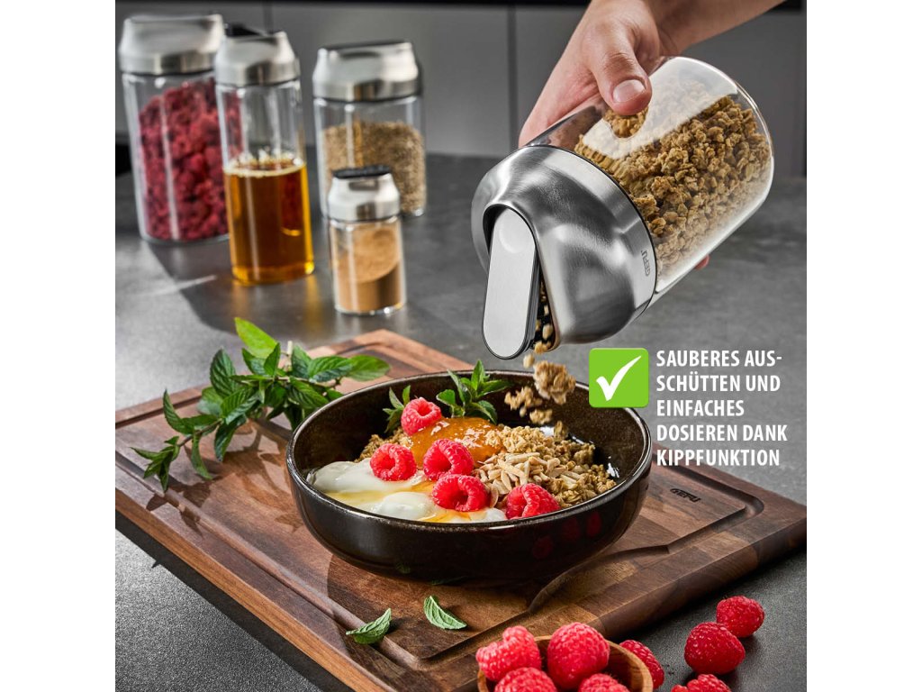 Nádoba na potraviny KIPPO je ideální volbou pro každého, kdo chce mít kuchyňské zásoby stylově uspořádané a snadno dostupné. Integrovaný naklápěcí mechanismus ve víku umožňuje plynulé a přímé dávkování bez nutnosti úplného odšroubování. Jednoduchým nakloněním lze přesně a čistě porcovat cukr, mouku, müsli, těstoviny i další suché potraviny.