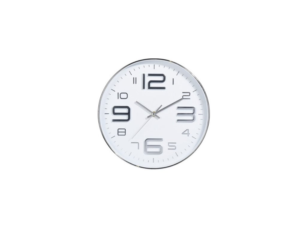 Ručičkové hodiny mají velké výrazné číslice. Číslice, ručičky a lem hodin jsou stříbrné. Jednoduché a nadčasové hodiny, které se hodí do každého interiéru.