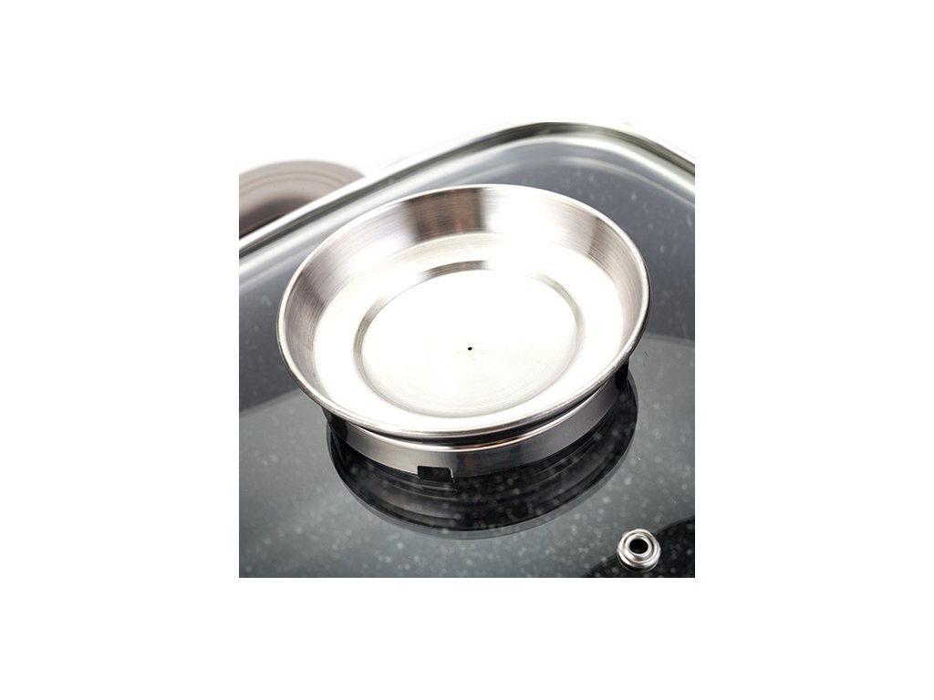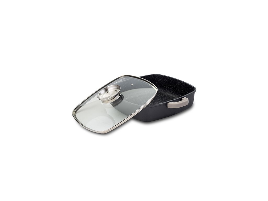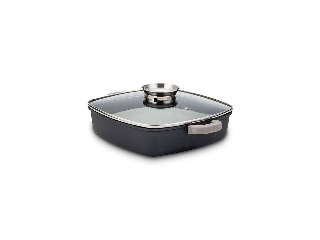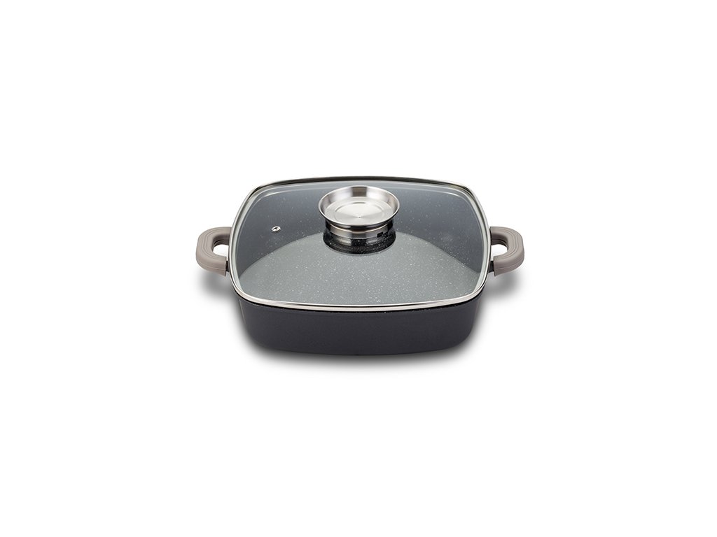 Zapékací hrnec o o rozměrech 28x28 cm je ideální pro každodenní použití v kuchyni. Kombinuje kvalitu s moderním designem. Jedná se o praktický hrnec vyrobený z litého hliníku s nepřilnavým povrchem bez PFOA. Ergonomické rukojeti s odnímatelnými silikony pro příjemné a bezpečné uchopení. Součástí je poklice s odolným termo úchytem. Vynikající rozložení teploty pro dokonalou přípravu jídel. Snadno se čistí, je vhodný i do myčky na nádobí. Hrnec je vhodný i pro použití v troubě (bez úchytů). Hrnec má průměr základny 19 cm, výšku 12 cm a objem 4,3 l. Váha 1,8 kg