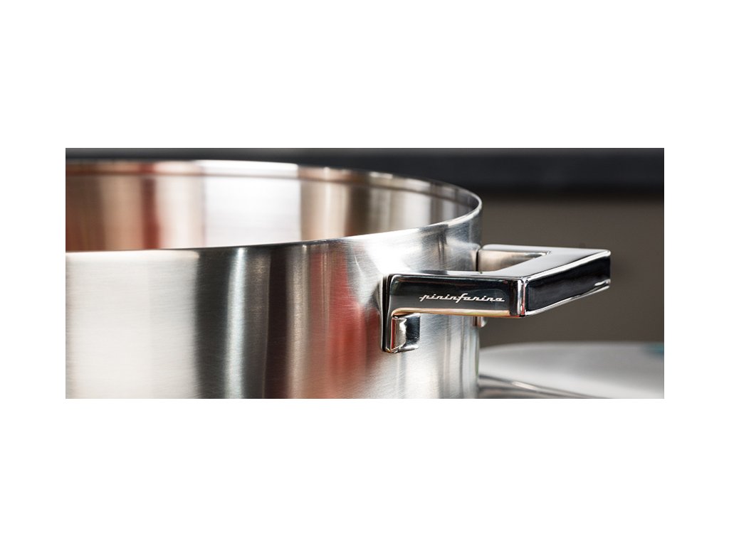 Masivní nádherné rukojeti s podpisem designéra - Pininfarina zdobí každý kus této kolekce. Opravdu nádherná kombinace strohého designu broušených hrnců s leštěnými úchytkami.