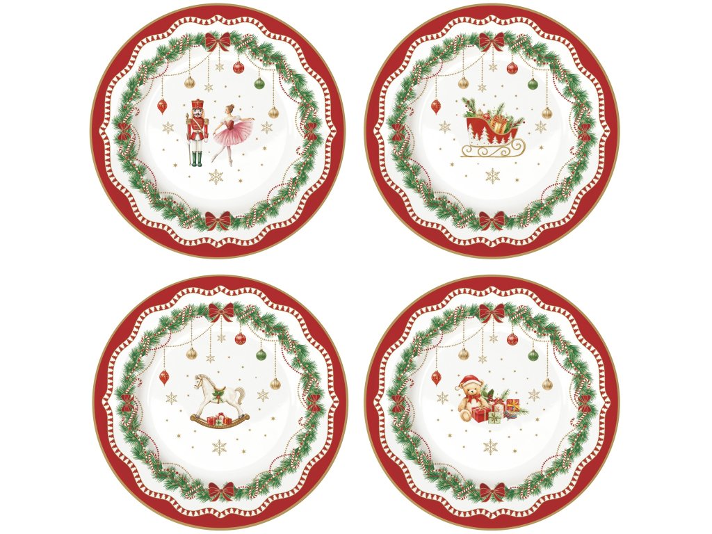 Čtyři porcelánové dezertní talíře Magie De Noel – kouzlo vánočního stolování. Vytvořte u stolu sváteční atmosféru s elegantní sadou Magie De Noel. Čtyři porcelánové dezertní talíře s vánočními motivy dodají každému setkání nádech pohody a slavnostní kouzlo. Každý talíř zdobí jemný a propracovaný motiv inspirovaný Vánocemi. Barvy jsou syté, detaily pečlivé. Vánoční stromečky, vánoční ozdoby nebo tradiční dekorace navodí radostnou náladu. Hodí se na vánoční večírky, slavnostní večeře i rodinné oslavy.