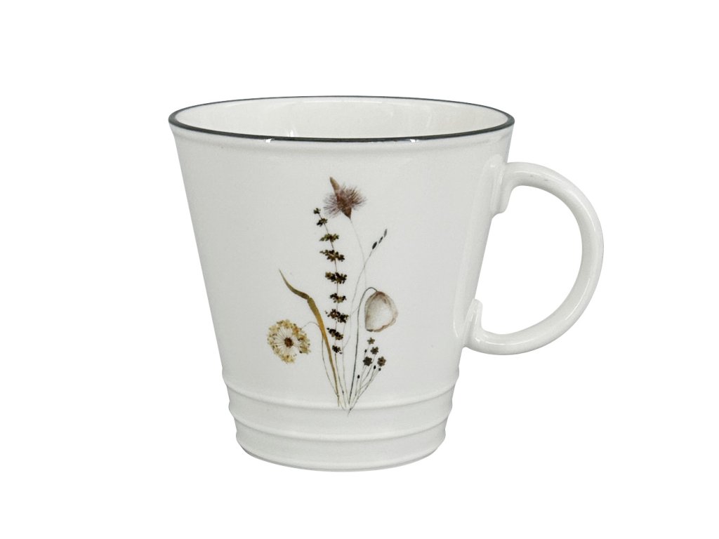 Hrnek Nostalgie Meadow přináší harmonii přírody na váš stůl díky jemnému dekoru lučních květin v neutrálních tónech. Šedý lem podtrhuje vintage vzhled inspirovaný smaltovaným nádobím a dodává na autentičnosti.