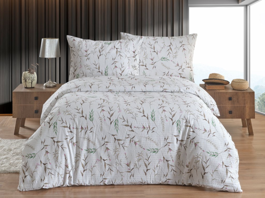 Povlečení je vyrobeno z velmi jemné 100% bavlněné tkaniny o plošné hmotnosti tkaniny 130g/m2. Krepování je vytvořeno pomocí speciální úpravy. Díky tomuto krepování se povlečení nemusí žehlit. Tkanina má vysokou hustotu velmi jemných přízí a pro tyto své vlastnosti je velice jemná a příjemná na omak. Ložní povlečení je vyrobeno s rozměrovou rezervou pro vysrážení po vyprání. Povlečení je vyrobeno v ČR s oblíbeným zipovým uzávěrem.