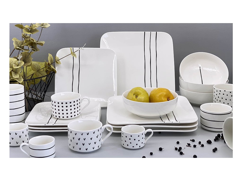 Kolekce Carré Grafico přináší moderní hranaté talíře. Porcelánové hranaté talíře se smetanovým nádechem mají zaoblené rohy, které celou kolekci zjemňují a dodávají ji na eleganci. Méně někdy znamená více. Životní moudro, které vystihuje dekor Grafico od české značky by inspire. Za použití jednoduchých geometrických tvaru vznikla hravá a kreativní kolekce pro mladé. Hranaté nebo chcete-li čtvercové talíře přinášejí svým netradičním tvarem do jídelny nový rozměr a zajímavost.