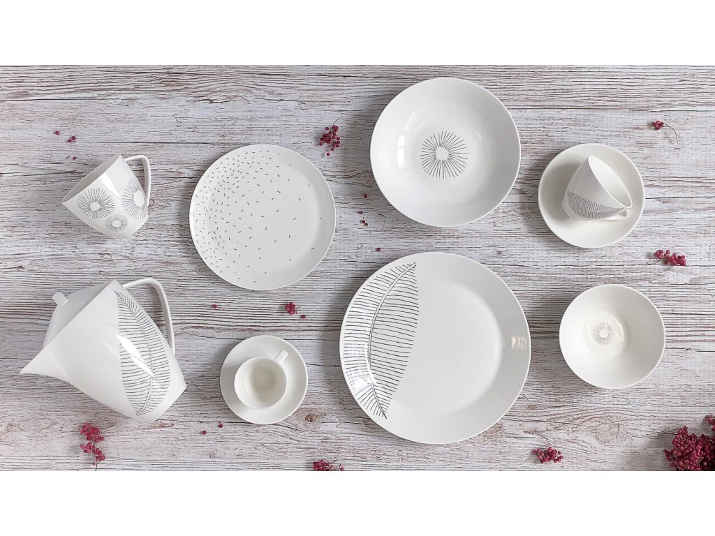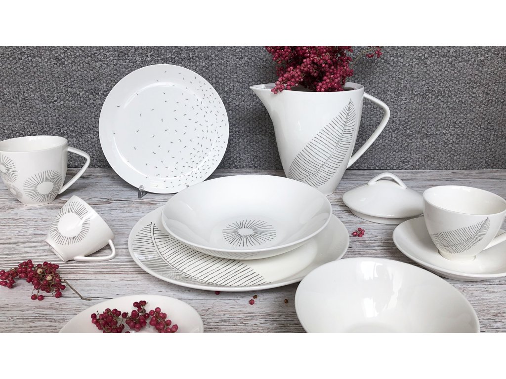 Kolekce porcelánového nádobí Lines od české rodinné značky by inspire...porcelán s českou duší. Velice kvalitní kostní porcelán s elegantním nádechem do smetanové barvy. Na tuto skvostnou porcelánovou sadu použili čeští designéři jednoduchý dekor ve světlešedé barvě. Pohráli si však s malbou a s variací různých druhů dekorů. Vznikla tak velmi nápaditá a moderní kolekce. I zde se nezapře inspirace přírodou.