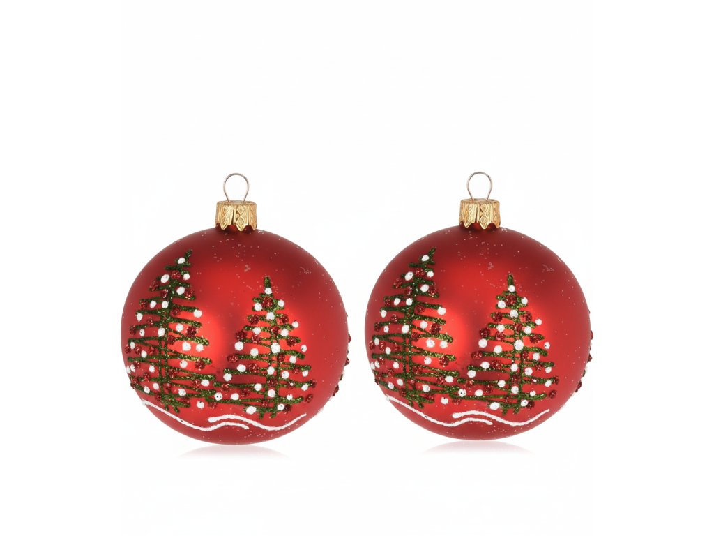 Sada 2 ks - Vánoční koule Deco skleněná s jehličnany, červená (8 cm)