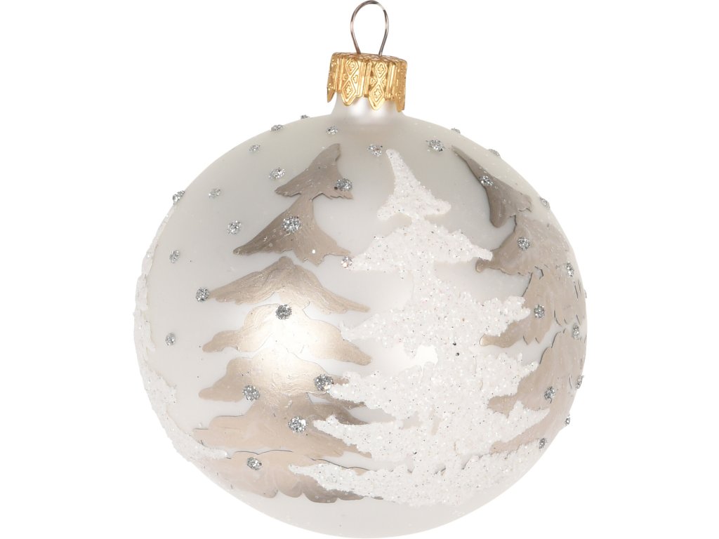 Sada 2 ks - Vánoční koule skleněná se stromky, perleťová/bílá (8 cm)