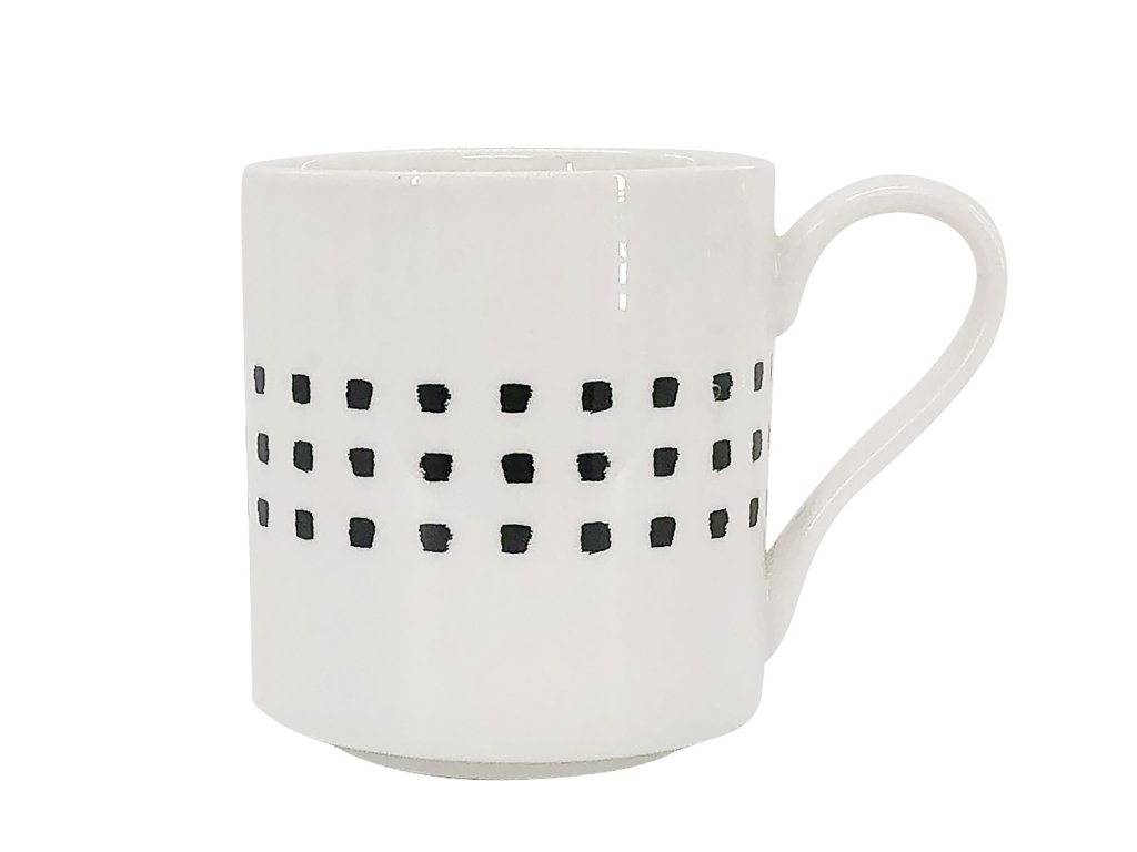 Kvalitní porcelán s nádechem smetanové barvy s černým dekorem. Tvar válce hrnku zaručuje dobrou stabilitu a je příjemný do ruky.