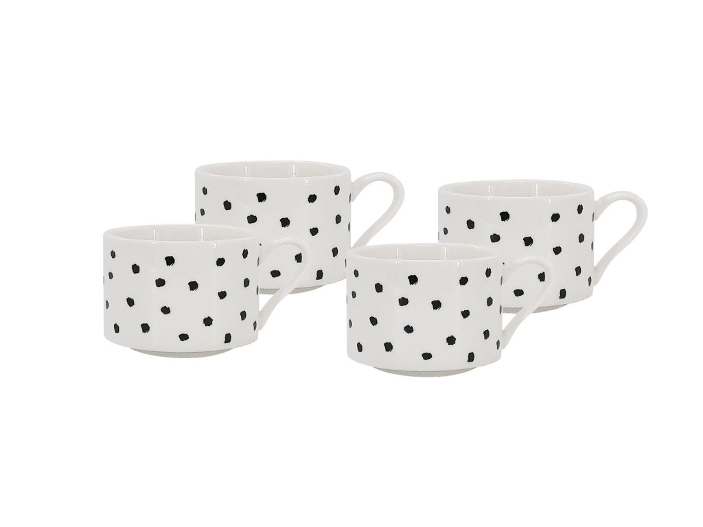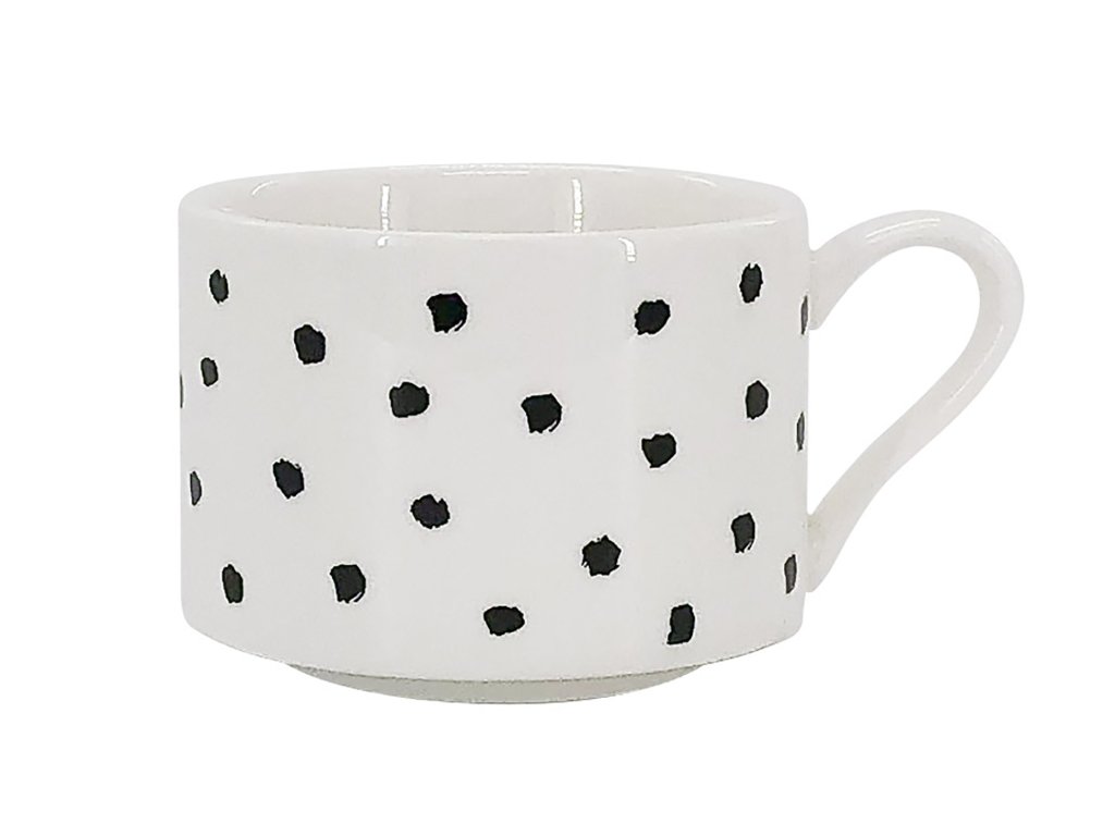 Kvalitní porcelán s nádechem smetanové barvy, posetý černými puntíky. Tvar válce hrnku zaručuje dobrou stabilitu a je příjemný do ruky.