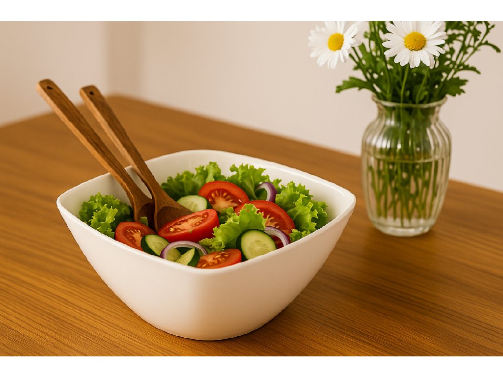 Elegantní čtvercová servírovací mísa z keramiky o rozměrech 26 × 26 cm s výškou 11 cm doplněná o praktické salátové náčiní z akáciového dřeva představuje ideální kombinaci funkčnosti a přírodního designu. Mísa je vhodná pro servírování salátů, těstovin, ovoce nebo příloh a stane se stylovým doplňkem každého stolu.