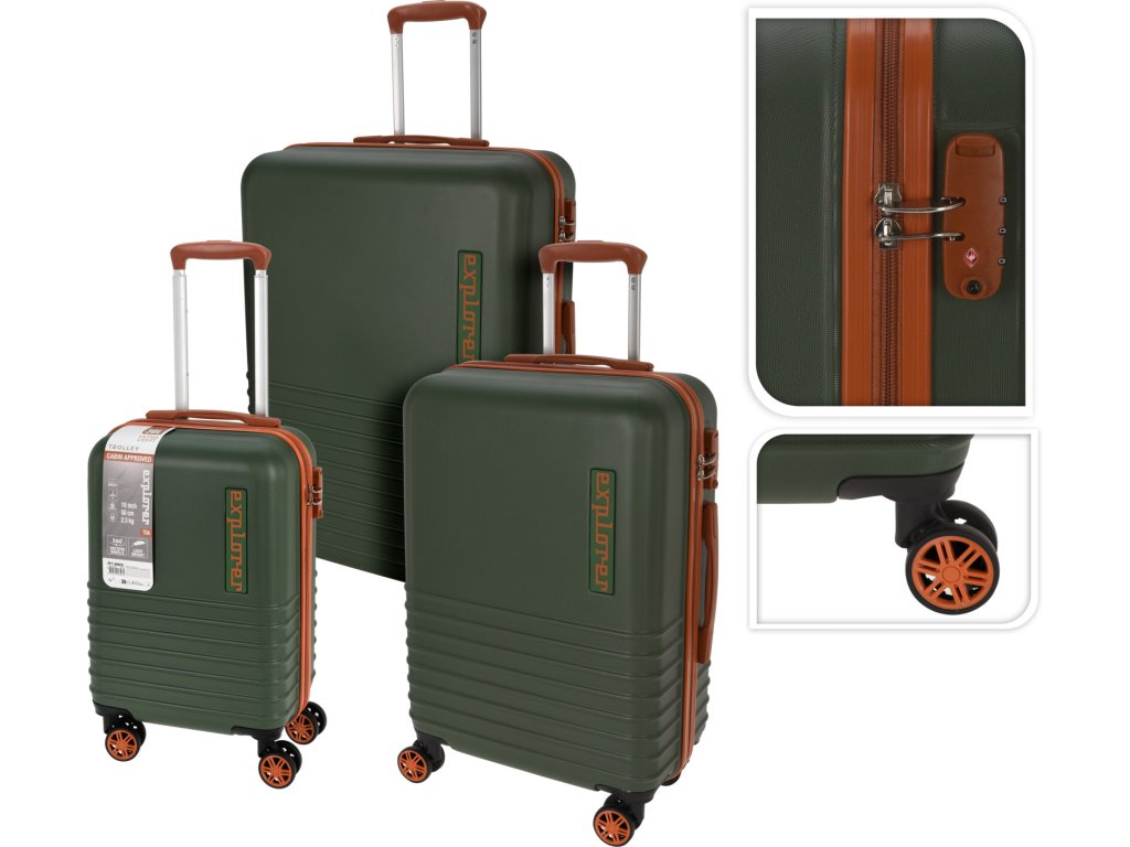 Objevte spojení funkčnosti a stylu s cestovní sadou kufrů Explorer. Tato tříkusová sada obsahuje kufry velikostí 18", 22" a 26", vyrobené z odolného ABS materiálu v zelené barvě s elegantními koňakovými detaily.