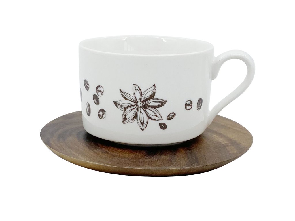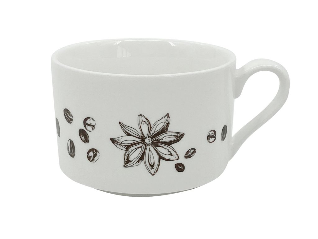 Kvalitní porcelán s nádechem smetanové barvy s dekorem rozsypaných kávový zrn a badyánu. Tvar válce hrnku zaručuje dobrou stabilitu a je příjemný do ruky.