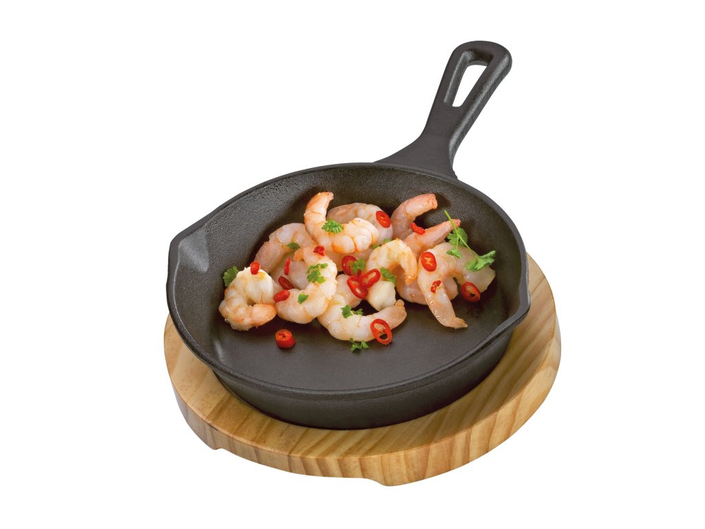 Stylové a udržitelné řešení pro váš příští grilovací večer. Grilovací/servírovací pánev s dřevěnou deskou od společnosti KÜCHENPROFI využijete k šetrné přípravě menších pokrmů a příloh, jako jsou mořské plody, kozí sýr s medem a rozmarýnem nebo křupavá zelenina. Marináda zůstane na jídle, nic nekape do otevřeného ohně. Pánve z tepelně odolné litiny udrží jídlo dlouho teplé. Jsou pevně vyrobené a představují ekologickou alternativu k jednorázovým hliníkovým pánvím. Pokud počasí nepřeje, lze grilovací/servírovací pánve použít na varné desce. Jsou vhodné pro všechny typy varných desek a lze je samozřejmě používat i v troubě. Pokud grilovací pánev naplníte cuketami, paprikami, rajčaty a česnekem, navrch rozdrobíte ovčí sýr a podáváte s čerstvou bagetou, můžete vytvořit středomořskou atmosféru i bez slunce. Grilovací pánev můžete přenášet pomocí robustní rukojeti, zatímco prkénko z borovicového dřeva je ideální pro stylové servírování. Chytré: prohlubeň v prkénku pánev bezpečně drží.