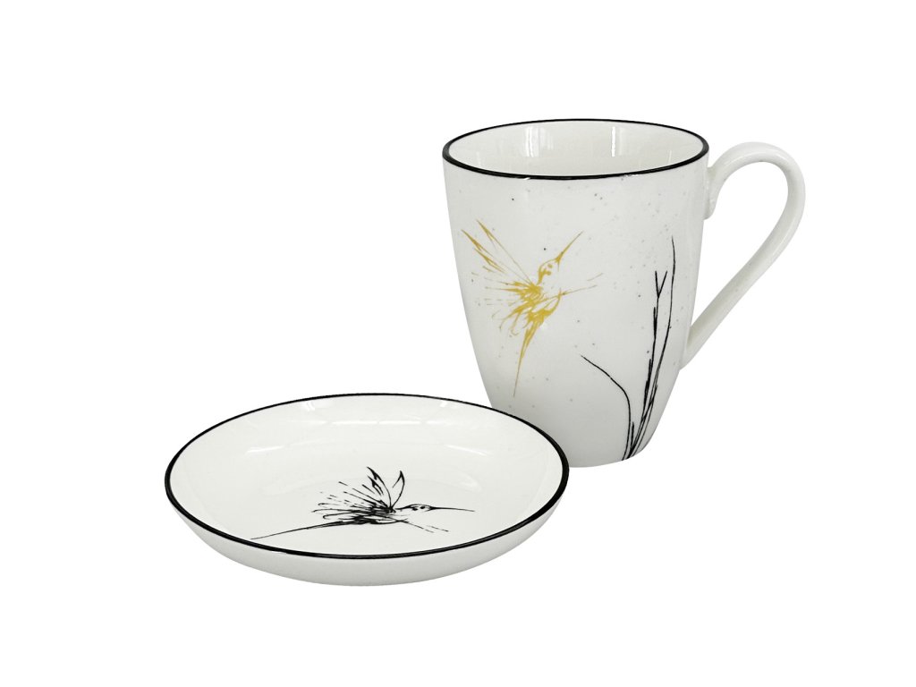 Set 2 ks - Hrnek 450ml a mistička Bird, bílá/černá/zlatá