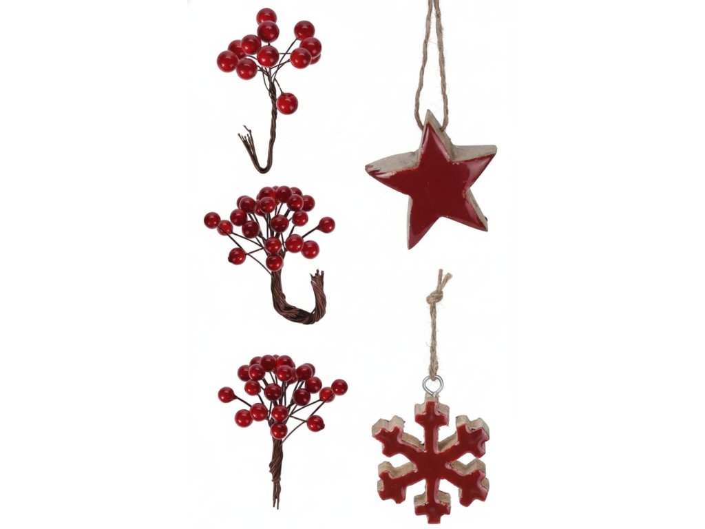 Set 5 ks - Zápich červené jeřabiny + Dřevěné vánoční ozdoby