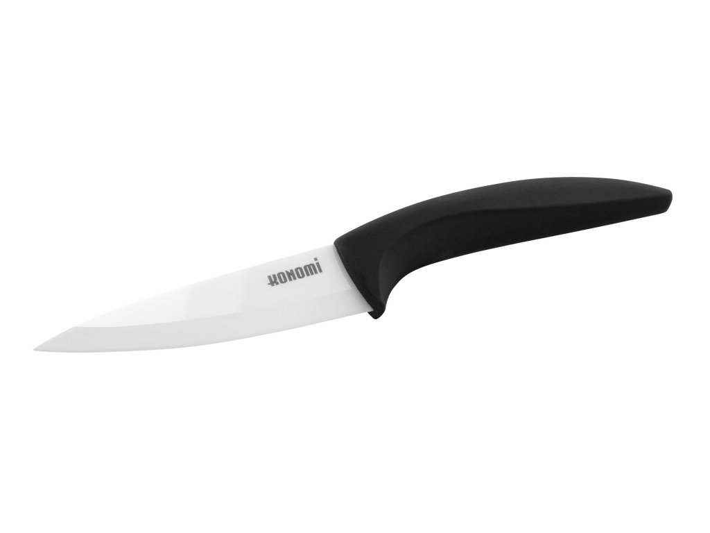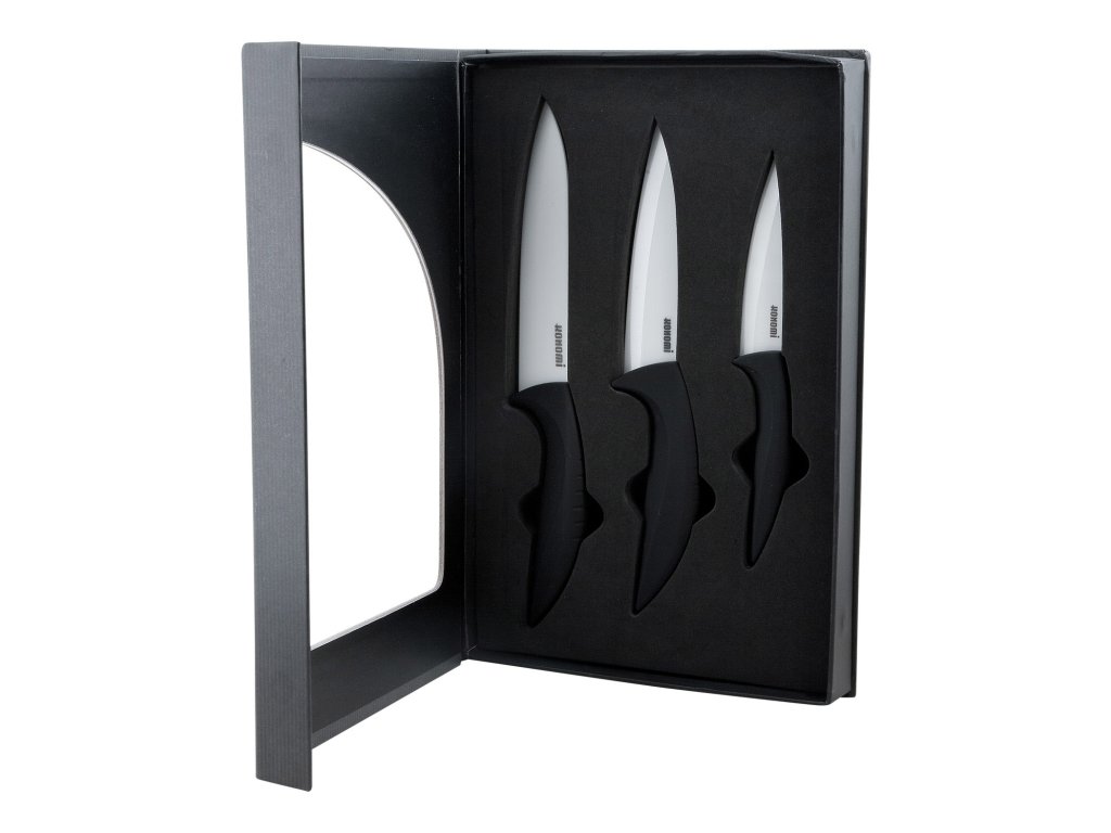 Trojdílná sada keramických nožů s bílou čepelí a černou plastovou rukojetí s úpravou "soft touch" pro příjemnější pocit při držení nože. Keramické ostří je extrémně tvrdé a ostré, neničí vitamíny ani enzymy, nezanechávají pach ani pachuť ocele a snadno se čistí.