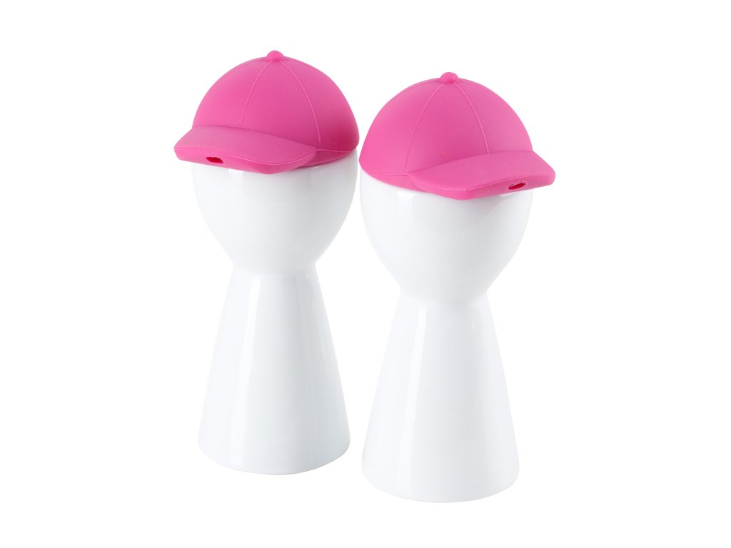 Nádoby na olej a ocet mají porcelánové tělo a silikonové víko v růžové barvě. Silikonové víko je vyrobeno ve tvaru kšiltovky.