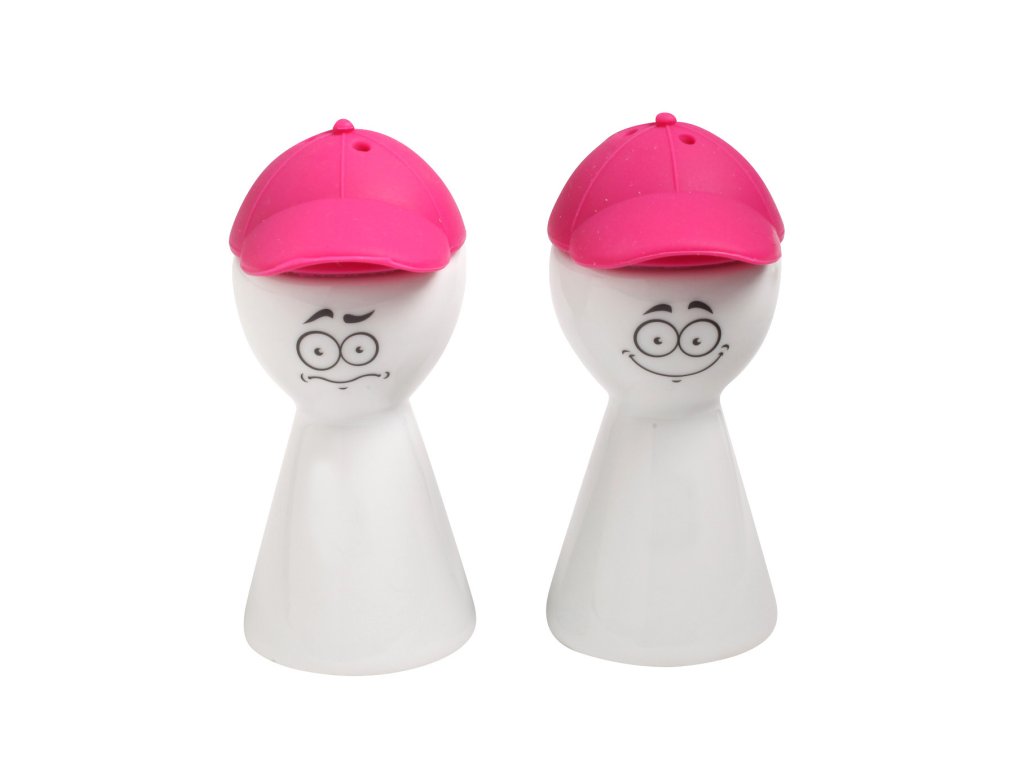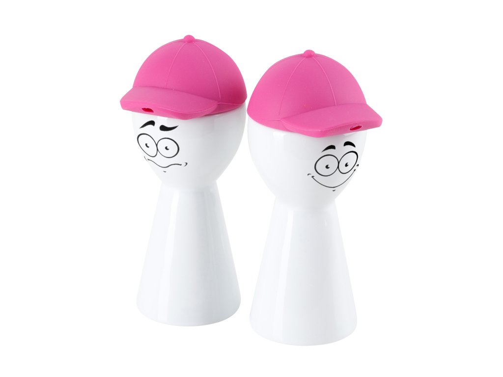 Nádoby na olej a ocet mají porcelánové tělo a silikonové víko v růžové barvě. Silikonové víko je vyrobeno ve tvaru kšiltovky. A tak jsme nádobám vytvořili obličeje. Vznikla tak vtipná a hravá minikolekce Face.