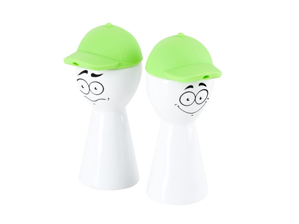 Nádoby na olej a ocet mají porcelánové tělo a silikonové víko v zelené barvě. Silikonové víko je vyrobeno ve tvaru kšiltovky. A tak jsme nádobám vytvořili obličeje. Vznikla tak vtipná a hravá minikolekce Face.