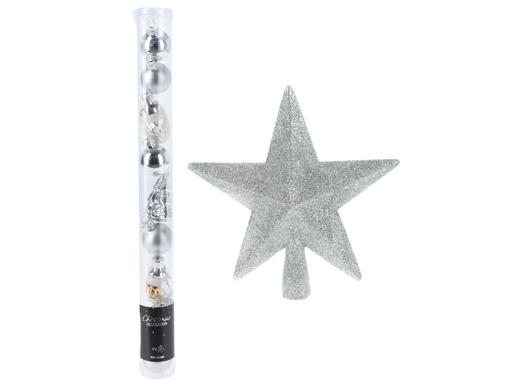 Set - Stříbrná špička na vánoční stromek + Sada vánočních ozdob ø 3 cm, 9 ks, stříbrná