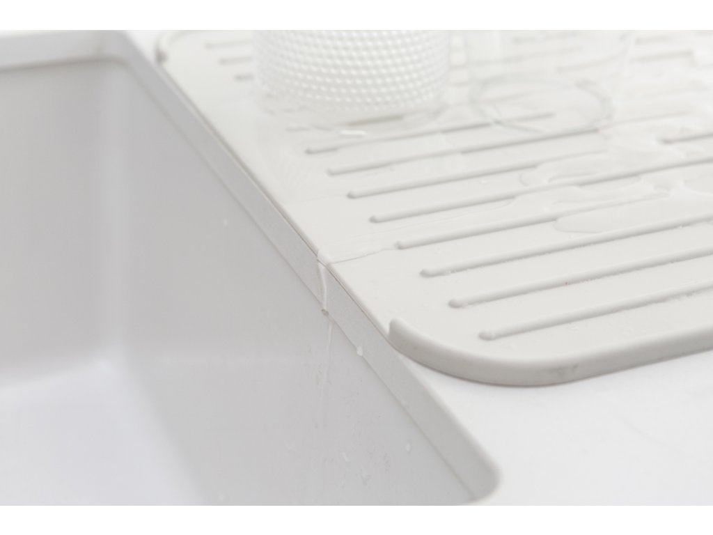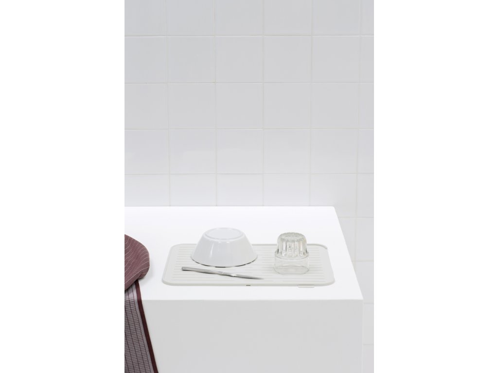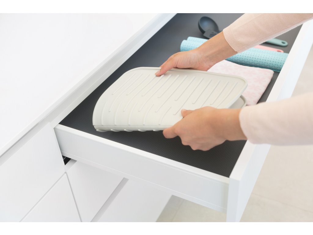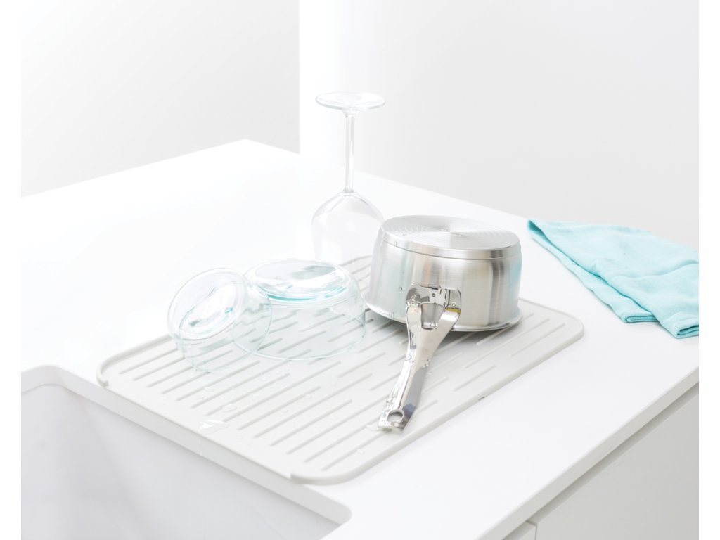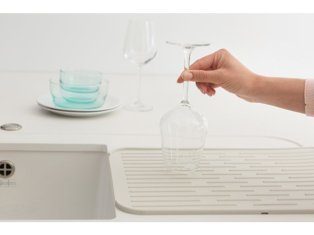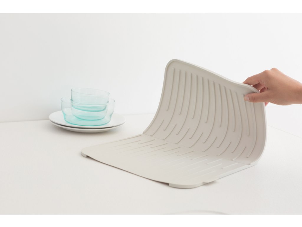 I v dnešní době myček na nádobí, najdeme v naší domácnosti kousky nádobí, které myjeme v ruce. Ať už potřebujeme čisté nádobí hned, už se nám nevešlo do myčky nebo třeba není vhodné do myčky nebo zkrátka myčku nemáme. Ve všech případech se vám bude hodit jednoduchý odkapávač na nádobí od holandské značky Brabantia vyrobený z měkkého neklouzavého silikonu. Voda z nádobí odtéká přímo do dřezu a pracovní deska zůstává suchá.