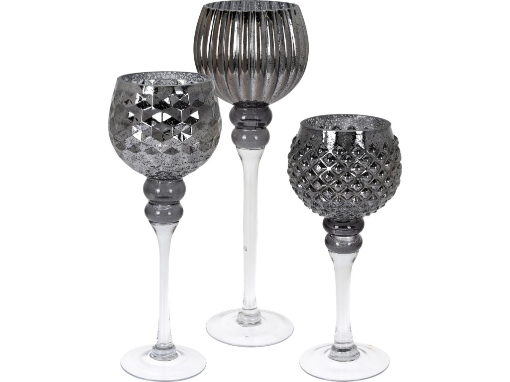 Můžete si pořídit celou sadu luxusních skleněných svícnů - sada 3 ks různých velikostí a designu.Každý svícen v jiné velikosti a jiným embosovaným designem.