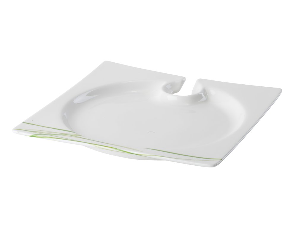 Talíř na dezert, snack nebo jednohubky má čtvercový tvar. Dezertní talíř disponuje výřezem pro zavěšení sklenice na víno.