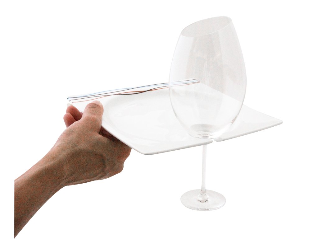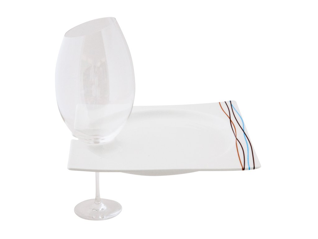 Talíř na dezert, snack nebo jednohubky má čtvercový tvar. Dezertní talíř disponuje výřezem pro zavěšení sklenice na víno.
