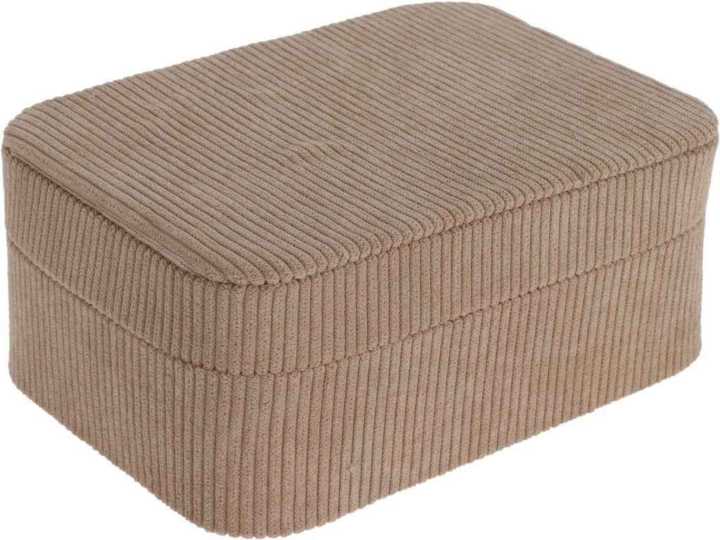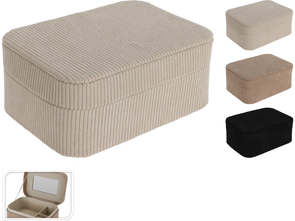 Je potažena hnědým manšestrem, což jí dodává příjemný vzhled. Uvnitř najdete tři oddělené části, které vám umožní organizovat vaše šperky tak, aby byly vždy snadno dostupné a přehledné.