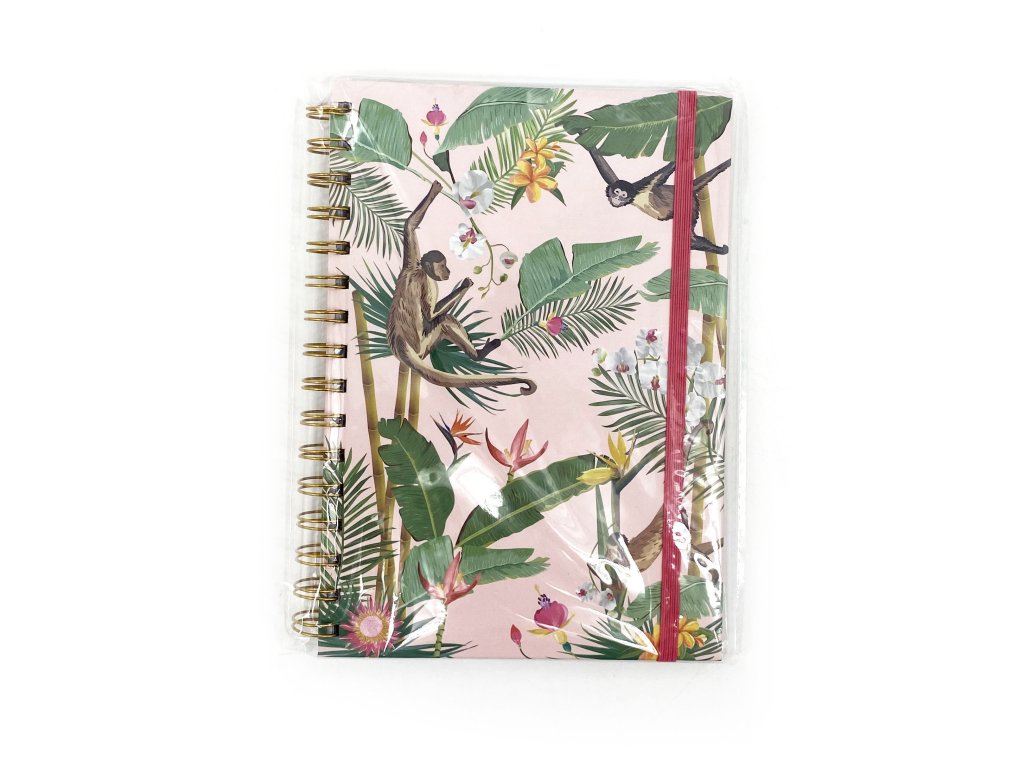 Dívčí linkovaný notes A5 se spirálovou vazbou Pevné desky s gumičkou a tropickým motivem.