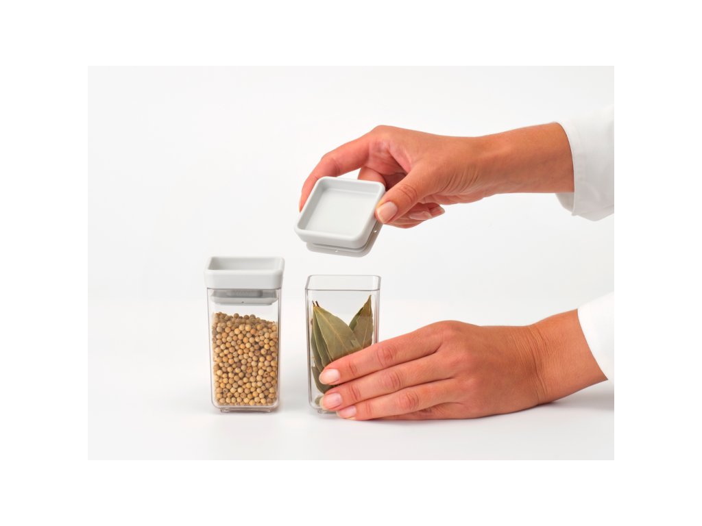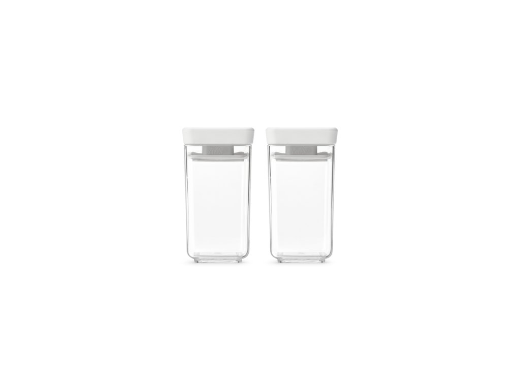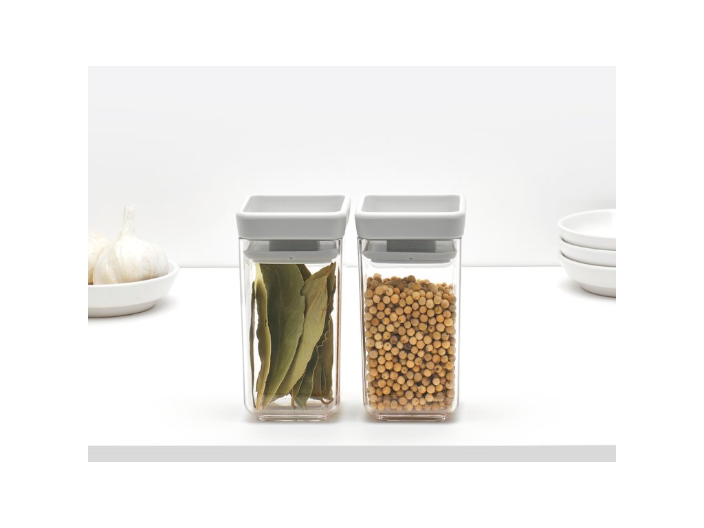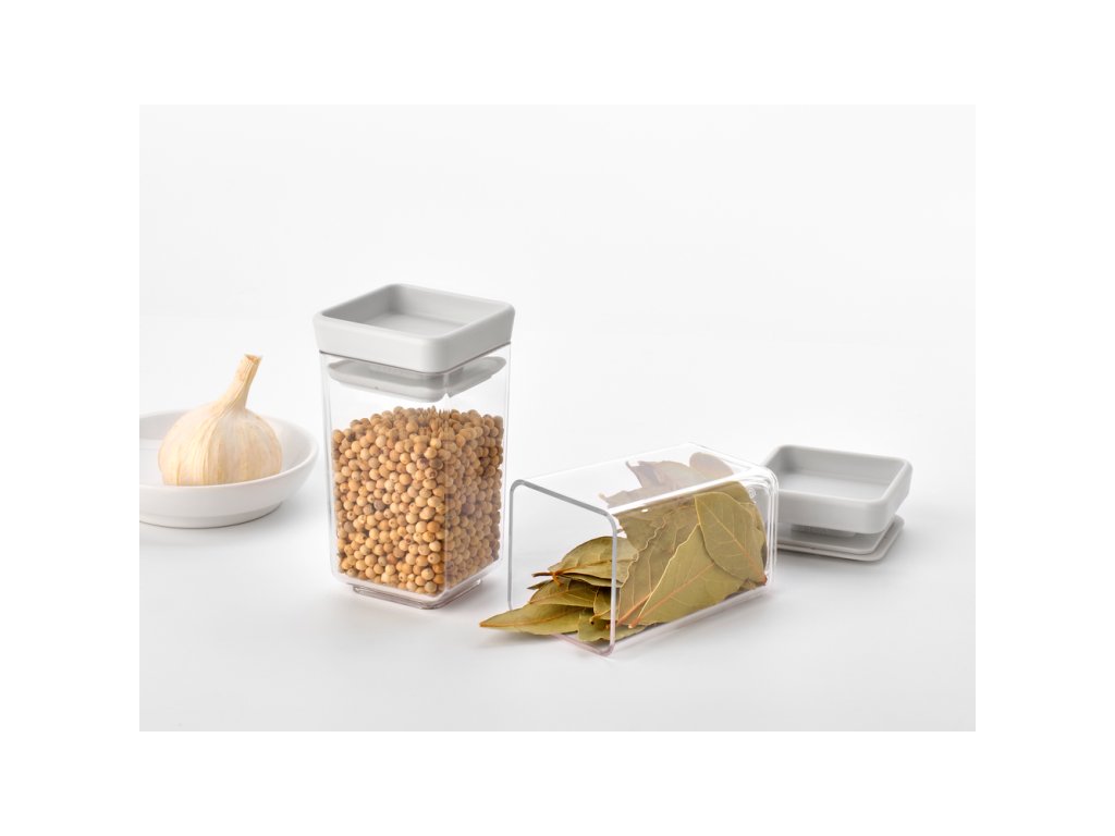 Dóza Square - Tasty+ stohovatelné dózy, 2 ks, 2 x 0,15 litru, materiál plast bez BPA, hranatý tvar, průhledné tělo, světle šedé víko.