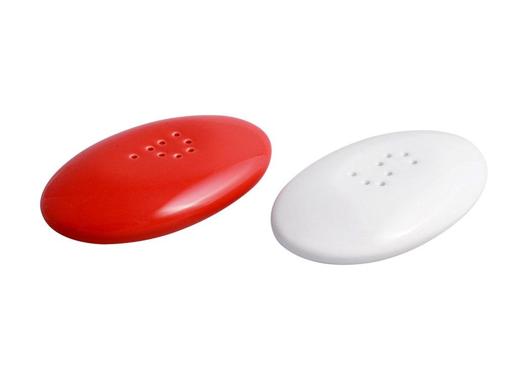 Sůl a pepř v podobě oválných kamenů v červeno bílé kombinaci barev. Sůl a pepř na váš stůl, pro vaše originální stolování.