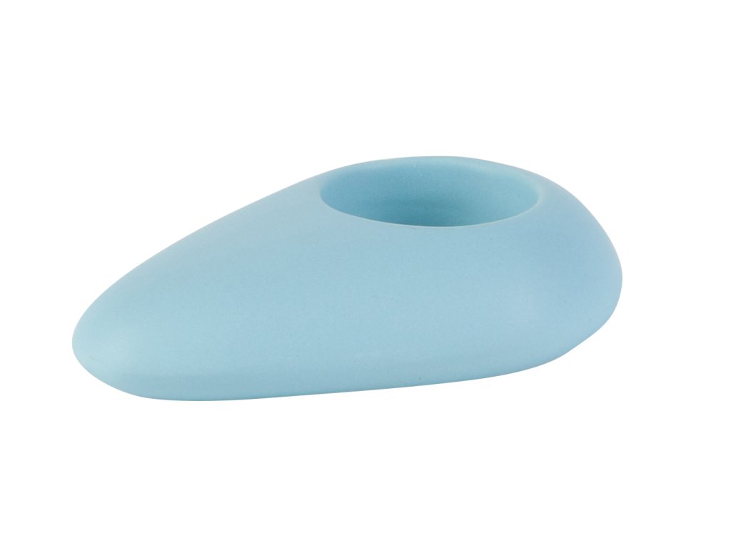 Keramický svícen na jednu čajovou svíčku ve tvaru kamene v matné jemné modré barvě.