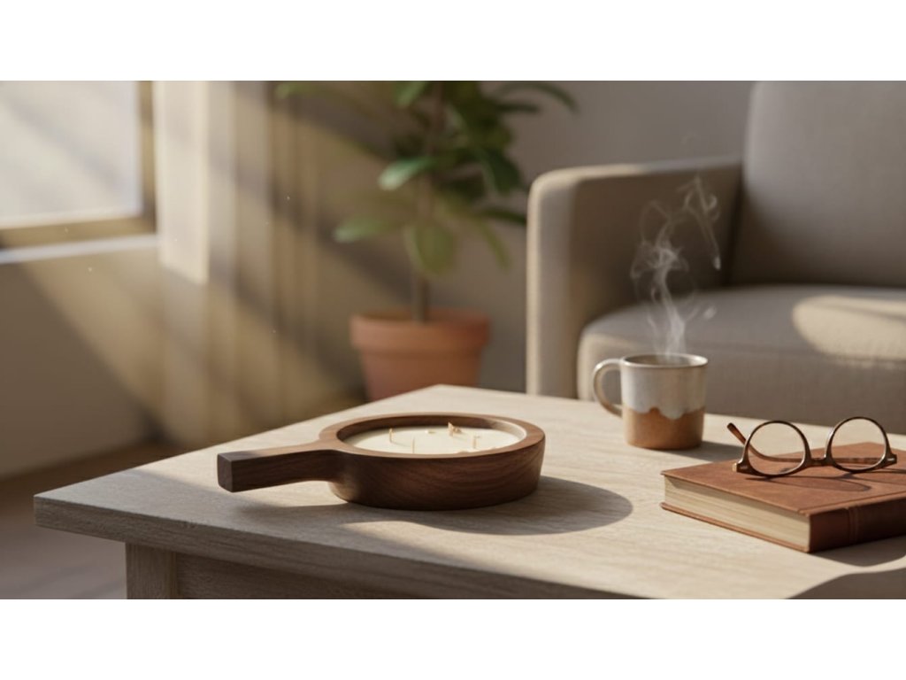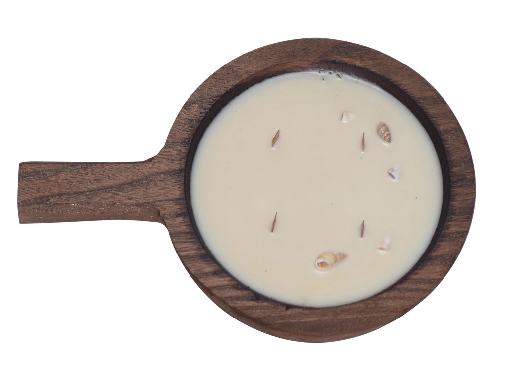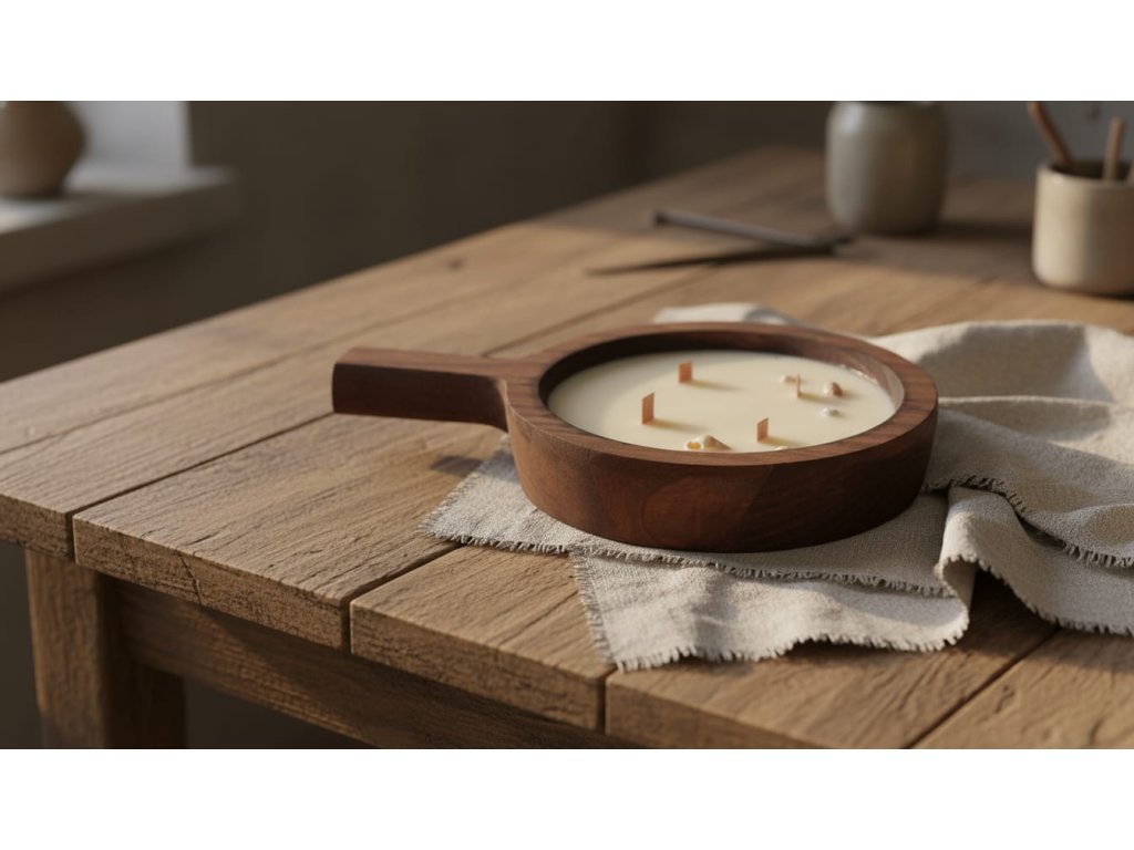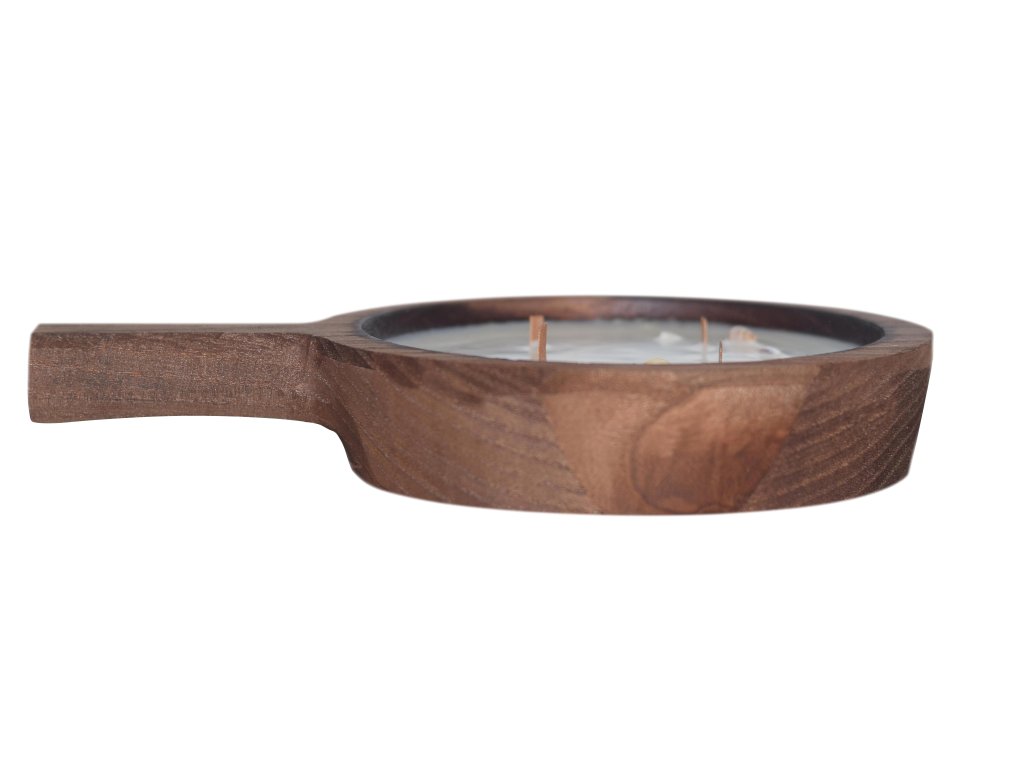 Vytvořte si útulnou a hřejivou atmosféru s Dekorativní svíčkou FlamePan. Tato svíčka je zasazena do originální dřevěné misky, jejíž design je inspirován tvarem rustikální pánve s krátkou rukojetí. Miska je vyrobena z oblíbeného Paulovnie dřeva, které je surové a mořené do tmavšího odstínu, což zvýrazňuje jeho texturu a dodává celku sofistikovaný a zemitý tón.