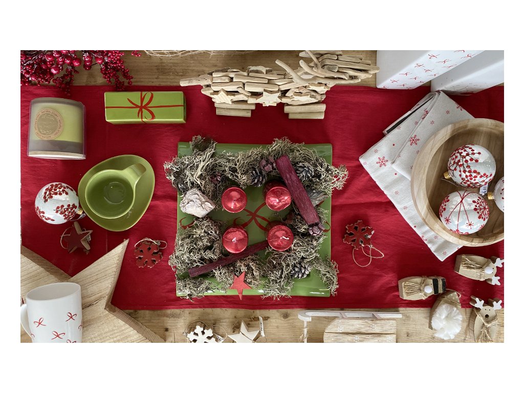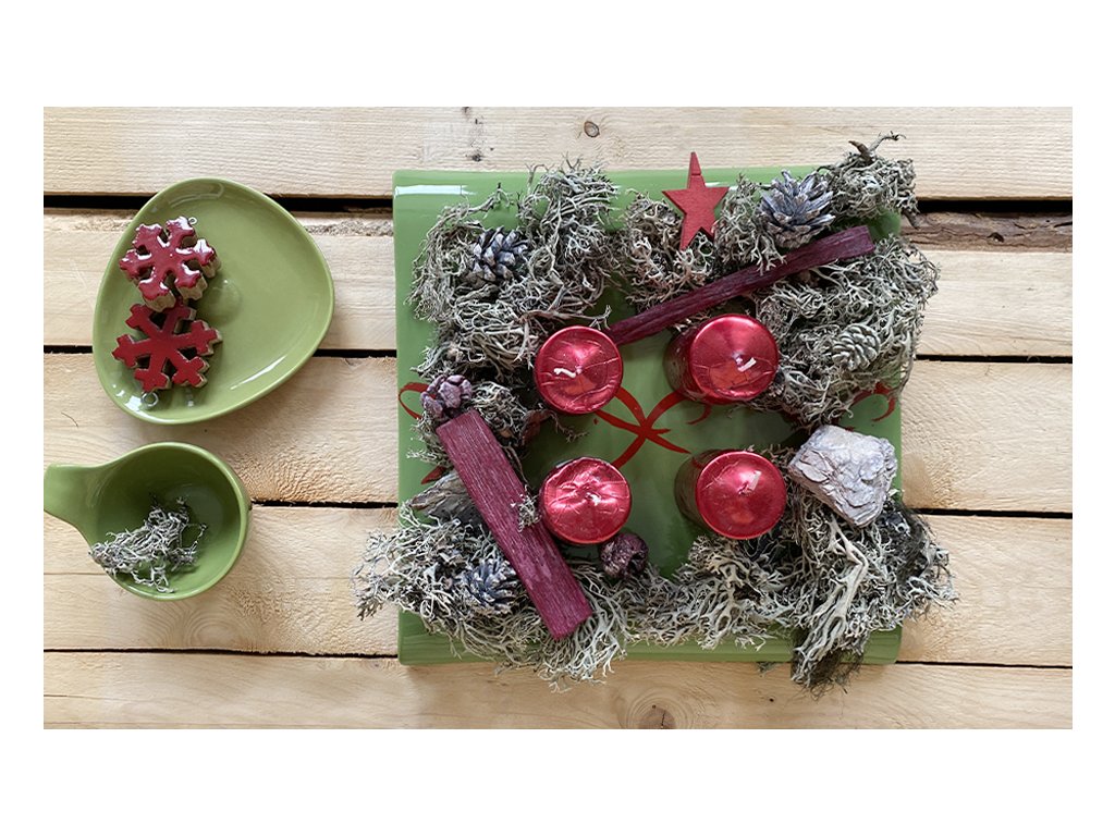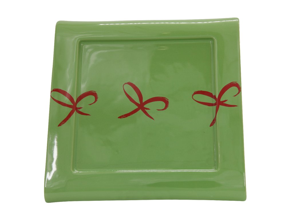 Zelený keramický tác má hranatý tvar. Červený dekor mašle připomíná zabalený dárek. Díky slavnostnímu dekoru červené mašle je tác jako stvořený pro podávání domácího upečeného cukroví.