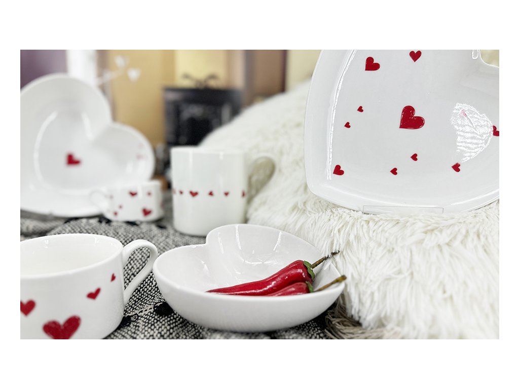 Porcelánový talíř Srdce Valentýn o průměru 20 cm je dokonalým spojením elegance a romantiky. Tvar srdce a bílý povrch s jemnými červenými srdíčky dodávají tomuto talíři jedinečný styl, který ozvláštní vaše stolování nejen na Valentýna, ale i při běžných příležitostech.