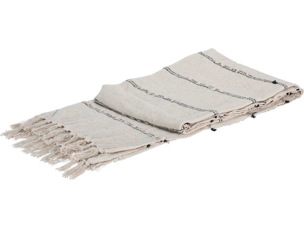 Design: Pléd má béžovou barvu s tenkými černými proužky, které dodávají produktu moderní a elegantní vzhled. Okraje jsou zdobeny třásněmi, což přidává do designu jemný a dekorativní prvek.