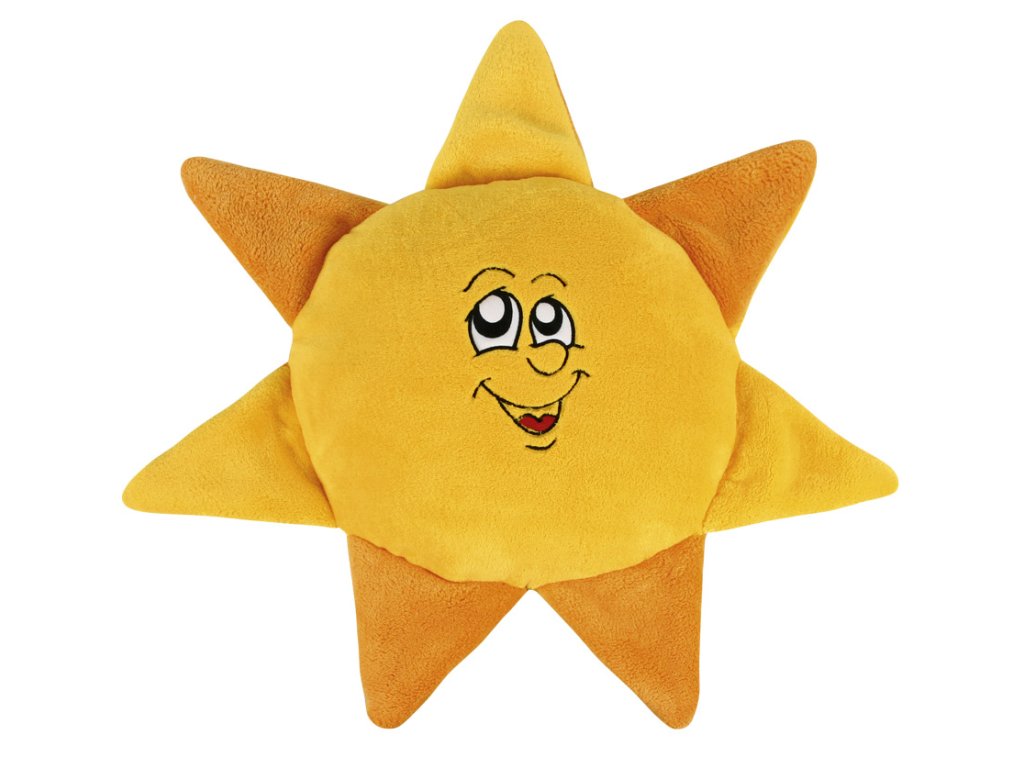 Tvarovaný polštářek o průměru 34 cm s motivem sluníčka.