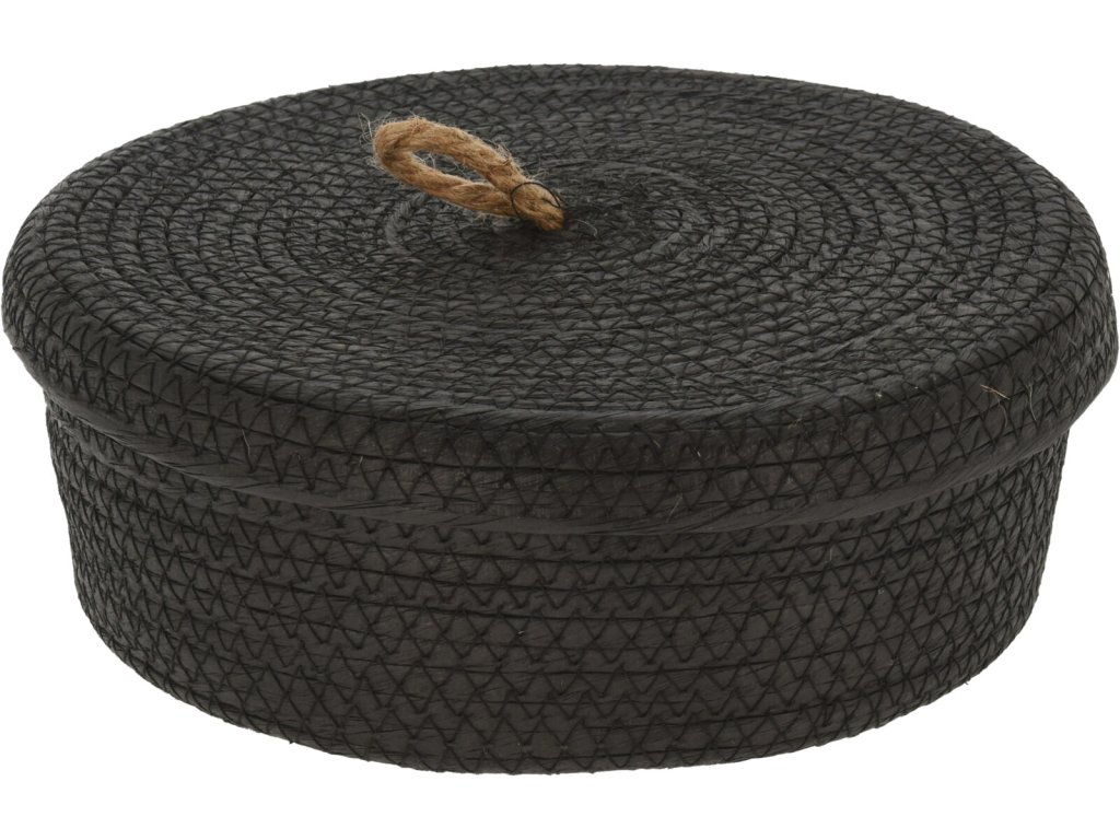 Elegantní černé provedení, odolný materiál z papírového kompozitu a praktické víko s jutovým poutkem z něj dělají ideální doplněk pro moderní interiéry. Díky svému rozměru Ø 21 × 8,5 cm nabízí dostatek úložného prostoru, aniž by zabíral příliš místa.