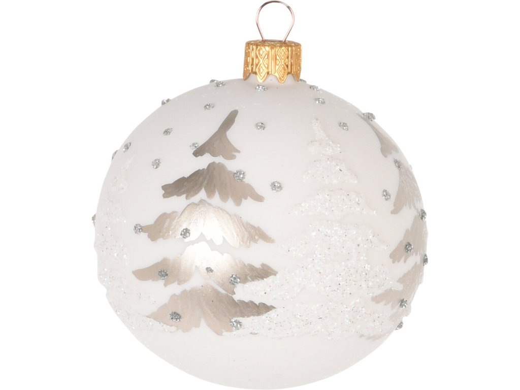 Vánoční koule skleněná s jehličnatým stromečkem, bílá (8 cm)