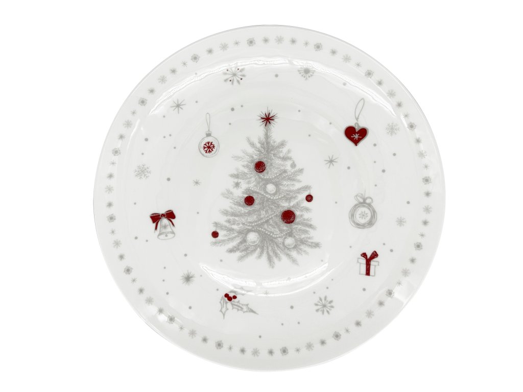 Nádherný sváteční design s hlavním motivem vánočního stromku v kombinaci šedých a červených tónů navodí tu pravou rodinnou pohodu. Jemný, ale přesto hravý dekor s vločkami, malými dárky a rolničkami je navržen s láskou tak, abyste si u stolu užívali každý moment. Kolem okraje talíře se vinou něžné hvězdičky a sněhové vločky, které vytvářejí dojem zimní krajiny a dodávají celému designu nevídanou eleganci.