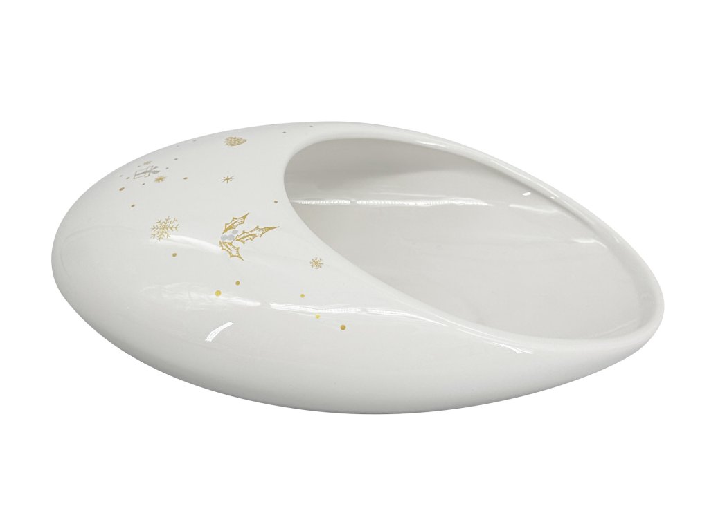 Keramická mísa Bean M z kolekce Zlatá koleda je dokonalým doplňkem pro vaše sváteční stolování. Vánoční mísa vyniká svým zlatým vánočním dekorem, který dodá vašemu interiéru kouzlo a eleganci. S rozměry 30x20x9 cm je ideální nejen jako mísa na cukroví, ale také jako dekorativní prvek pro vánoční tabuli.