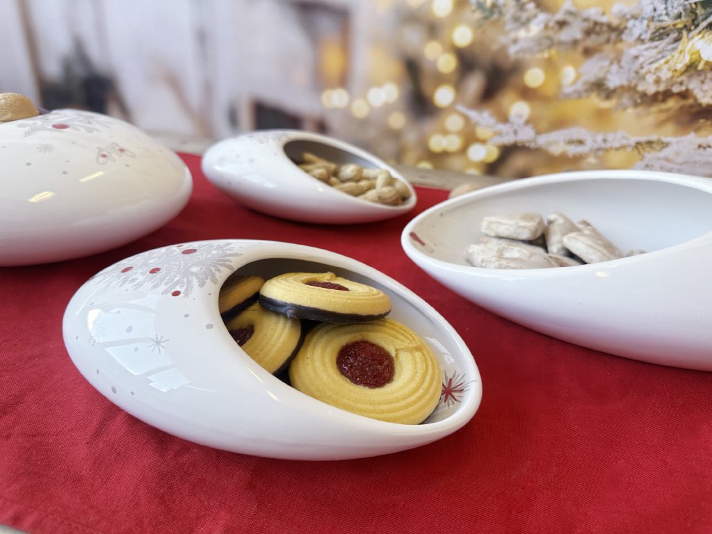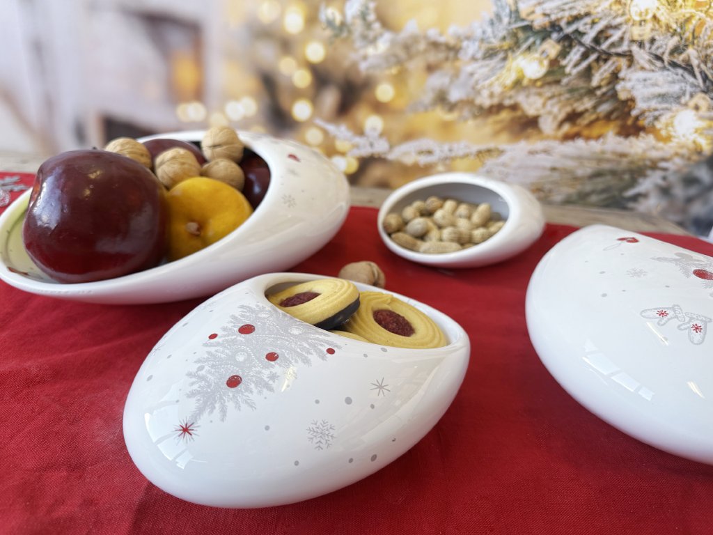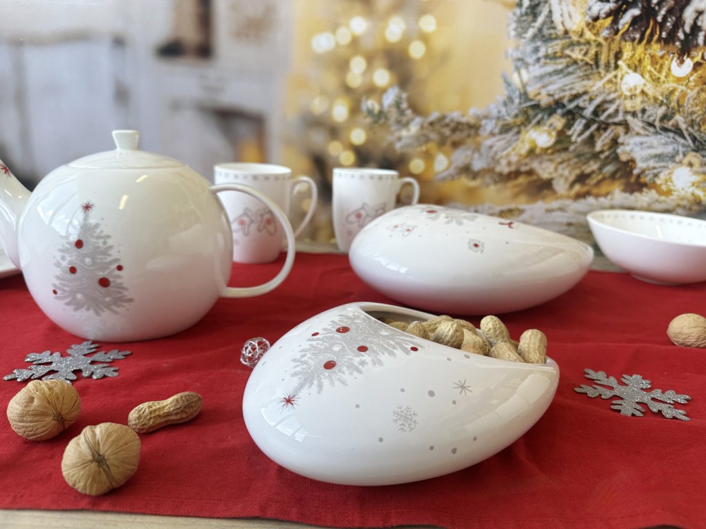 Díky velkorysým rozměrům je mísa M naprosto univerzální. Využijte ji jako mísu na podávání vánočních řízků a salátu, jako honosnou mísu na celoroční ovoce nebo na hromadu vánočního cukroví (třeba na oblíbené vanilkové rohlíčky či linecké). Slavnostní dekor Koleda v decentní šedo-červené kombinaci na sněhobílé keramice dodává míse punc elegance, která se hodí do každé jídelny. Zdobí ji ikonická vánoční větev, dárky a jemné vločky, které navozují tu pravou vánoční atmosféru.