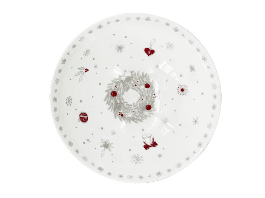 Jemný vánoční dekor v šedých a červených tónech promění každé jídlo v malou slavnost. Misku zdobí elegantní vánoční věnec a motivy sněhových vloček, které evokují zasněženou zimní krajinu. Minimalistický design na vnitřní straně misky doplňují roztomilé symboly rolničky, srdíčka a dárku, což celému kousku dodává hravý, ale stále elegantní vzhled.