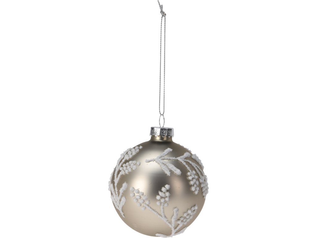 Vánoční skleněná baňka o průměru 8 cm v lesklé bronzové barvě přináší elegantní a sofistikovaný prvek do vaší vánoční výzdoby. Baňka je jemně zdobená reliéfem bílých větviček, které vytvářejí kontrast s lesklým povrchem, a dodávají tak ozdobě výrazný, ale zároveň jemný vzhled.