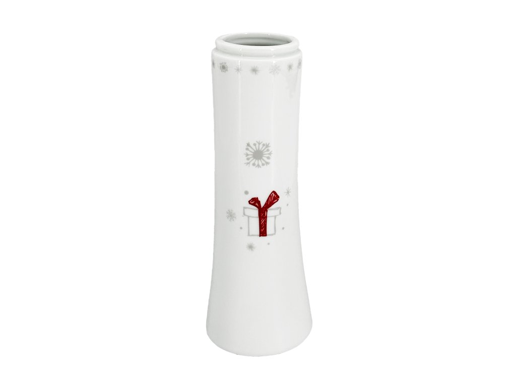 Tato krásná vánoční váza Koleda z porcelánu je dokonalým doplňkem pro vaši sváteční výzdobu. S rozměry 7,5 cm na šířku a hloubku a výškou 20 cm nabízí ideální prostor pro vánoční květinovou aranž. Váza je zdobená jemným vánočním dekorem se symbolem dárku a na zadní straně vánoční koulí v červené a šedé barvě, který dodává radostnou atmosféru Vánoc.