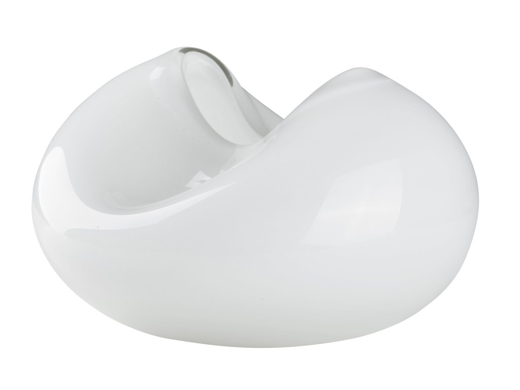 Skleněná bílá váza má nepravidelný neobvyklý tvar. Bílé sklo působí čistým dojmem